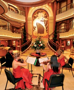 Cunard Queen Elizabeth. Naming Ceremony. Grand Lobby with Musicians.